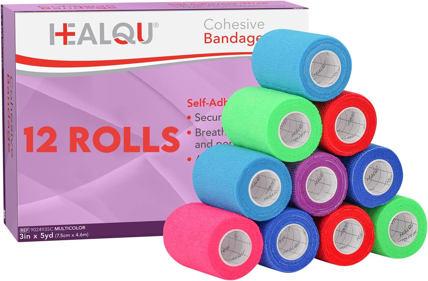 HEALQU Self Adhesive Bandage Wrap – Cohesive Tape for Athletic and Sports 3”x5yd, 12 Rolls - Self Adherent Medical Tape, Flexible, Elastic Bandages Multicolor for Wrist & Ankle Vet Wrap for Dogs