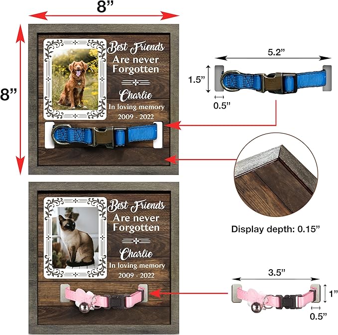 - ITEM DIMENSIONS: Our customized pet loss sign comes in two sizes, 8x8" and 8.7x10.6," and serves a variety of purposes. Additionally, you may use a personalized pet memorial frame as a table decoration or as a part of your home decor by placing it on a shelf, mantle, table, or wall. It will be a lovely pet memorial piece.