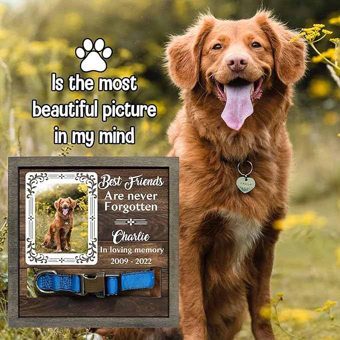 - HIGH-QUALITY MATERIAL: The dog collar picture frame for dog lovers is made of sturdy Plywood. Furthermore, we have two frame colors to choose from: grey and walnut. Having a beautiful keepsake to look at every day can help to alleviate some of the pain. Please keep in mind that the pet collar is NOT included.