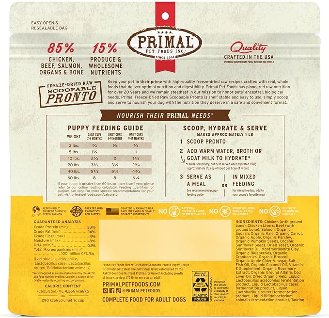 Primal Freeze Dried Puppy Dog Food, Pronto Mini Nuggets; Scoop & Serve, Complete & Balanced Meal; Also Use As Topper or Treat; Premium, Healthy, Grain Free, High Protein Raw Dog Food (16 oz, 2-Pack)