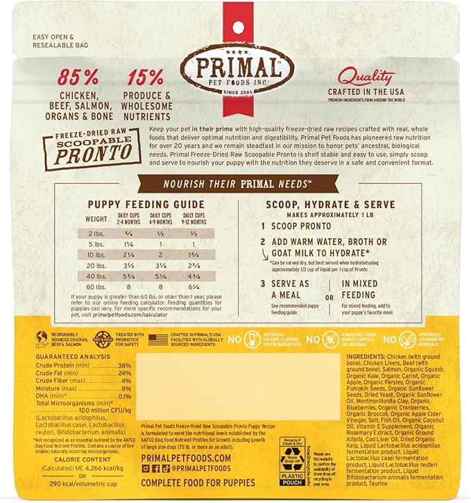 Primal Freeze Dried Puppy Dog Food, Pronto Mini Nuggets; Scoop & Serve, Complete & Balanced Meal; Also Use As Topper or Treat; Premium, Healthy, Grain Free, High Protein Raw Dog Food (7 oz)