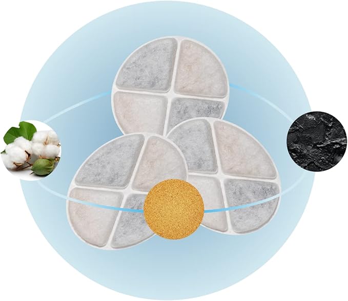 - MULTIPLE FILTRATION: This cat fountain filter replacement has triple filtration parts, which includes: 1) Fabric: isolating cat hair and food residue; 2) Activated carbon: filters micro particles such as sediment and rust to remove odors. 3) Resin: filters heavy metals, softens water quality, obtains clean water sources, increases pet water intake, and maintains their health and vitality