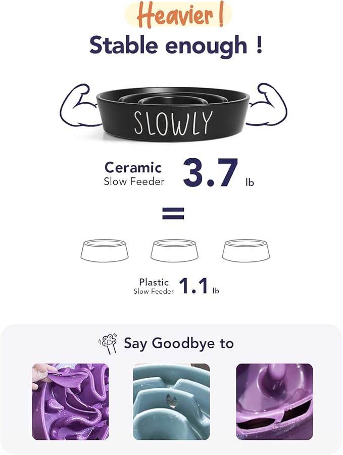 - Ceramic, Prevent Your Dog From Eating Plastic:We found that plastic slow food bowls are easily damaged by dogs, they will bite and eat by mistake. The surface of the plastic will also fall off during use, which is not conducive to a healthy diet for dogs. We use ceramic material, not easy to damage, so your dog could enjoy his food safely and healthily