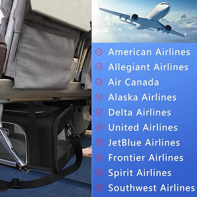 - ð¶ãCHECK SIZE BEFORE PURCHASEãIn order to match the airline's under-seat size, this carrier can only accommodate small dogs and cats. We recommend that you carry pets that measure 17.7 "long x11" wide x8.3 "high and weigh under 13LB cat or 9LB dog. Please do not only choose the luggage rack based on the weight, but also refer to the length and height of the pet. Maximum size requirements of major airlines for soft-sided pet carriers: â American Airlines: 19x13x9"â¡United Airlines: 18x11x11"â¢Southwest Airlines: 18.5x13.5x8.5"â£Alaska Airlines:17x11x11"â€Air Canada:21.5x15.5x10.5"â¥Delta Air Lines: 21.5x15.5x10.5"