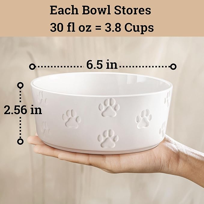 - CUTE & DECORATIVE - With cute allover paw imprints, these off-white ceramic bowls for pets serve as a decoration. Perfect for your kitchen, office, pet station or anywhere you feed your pet, these pet bowls will elevate your home décor.