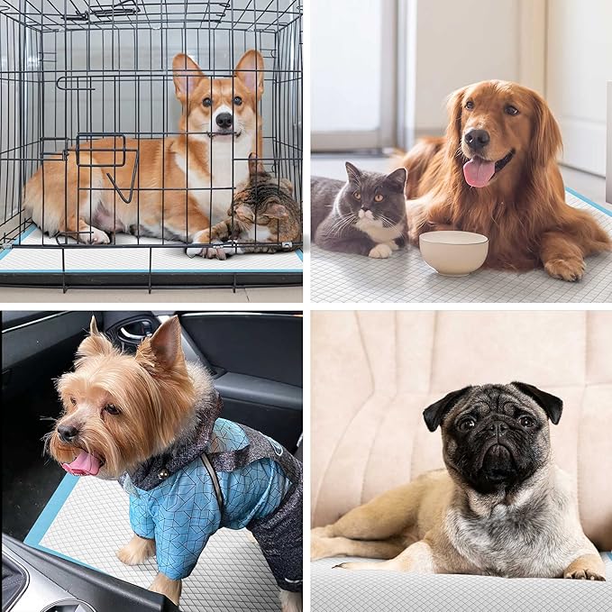 - 【Durable Leak-Proof and Essential for Home with Pets!】Our pet pee pads with PE film back and border to prevent any leaking, even in your absence by blocking leaks for 24 hours. Extra 12g Imported polymer material and 60g fluffy pulp, and the polymer core turns urine into gel quickly, keep pets dry and clean all the day