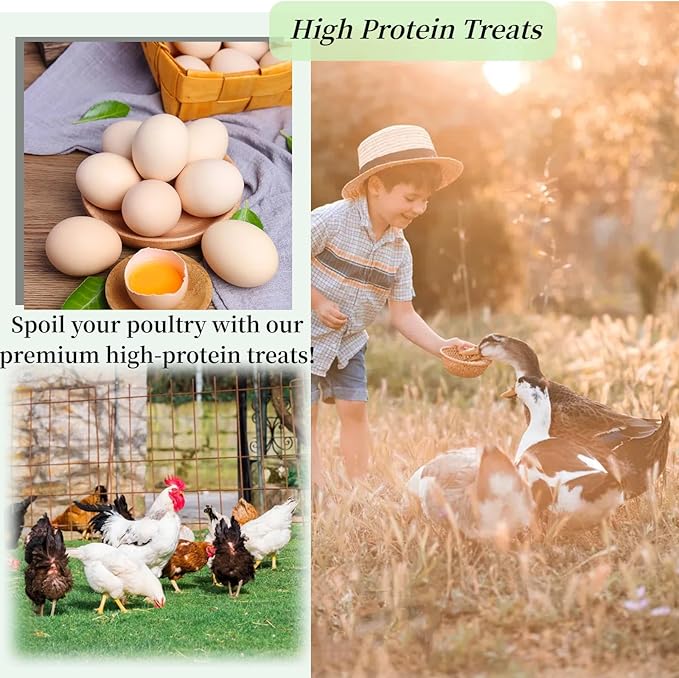 - 【Premium High-Protein Treats】Spoil your poultry with our premium high-protein treats! Your chickens will be delighted with every delicious bite, ensuring their happiness and health. These protein-packed treats are perfect for poultry, birds, reptiles, hamsters, turtles, fish, and hedgehogs
