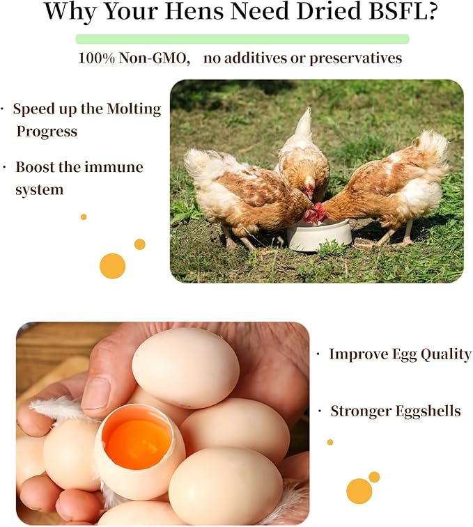 - 【Health-Boosting】Our dried black soldier fly larvae with its dense nutrients, can help speed up molting, assisting hens in regaining normal energy levels and egg production. Ideal for flock nutrition and attracting wild birds while promoting overall wellness