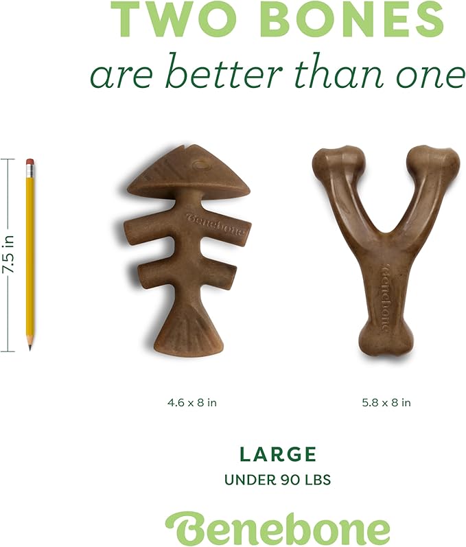 Benebone 2-pack Fishbone/Wishbone Durable Dog Chew Toys, Real Fish, Real Bacon, Made in USA, Large