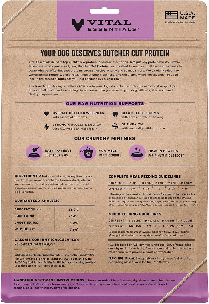 - CRUNCHY FREEZE-DRIED RAW TURKEY DOG FOOD: Vital Essentials Crunchy Freeze Dried Dog Food packs more protein than industry standard into every bite to deliver the peak vitality your dog deserves, especially when compared to dehydrated dog food. This complete and balanced freeze-dried raw dog food is made with premium butcher cut turkey, responsibly sourced in the USA.