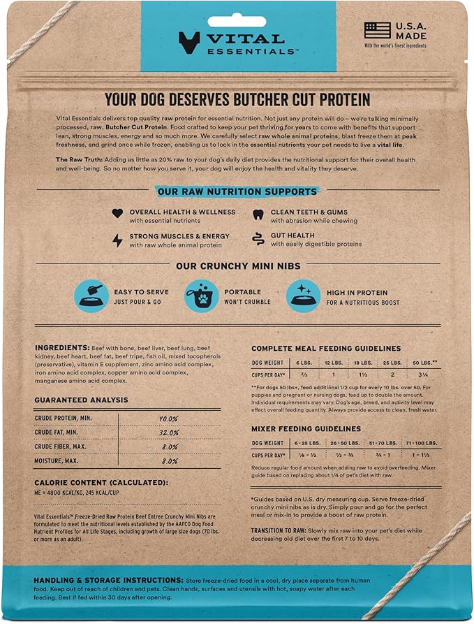 - CRUNCHY FREEZE-DRIED RAW BEEF DOG FOOD: Vital Essentials Crunchy Freeze Dried Dog Food packs more protein than industry standard into every bite to deliver the peak vitality your dog deserves, especially when compared to dehydrated dog food. This complete and balanced freeze-dried raw dog food is made with premium butcher cut beef, responsibly sourced in the USA.