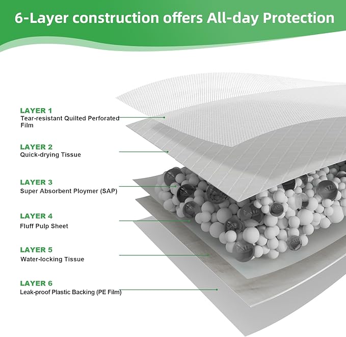 - Innovative 6-Layer Protection Design: The top layer of the pad uses a perforated film that is soft and comfortable, and can absorb urine quickly. The 2nd layer is activated carbon, it can eliminate odors effectively. The 3rd layer features diamond quilting ensuring urine flows in the right direction. The 4th layer is the polymer cotton core that can turn urine into gel instantly. The last two layers are important in keeping liquid leak-proof, especially the last layer of plastic backing.
