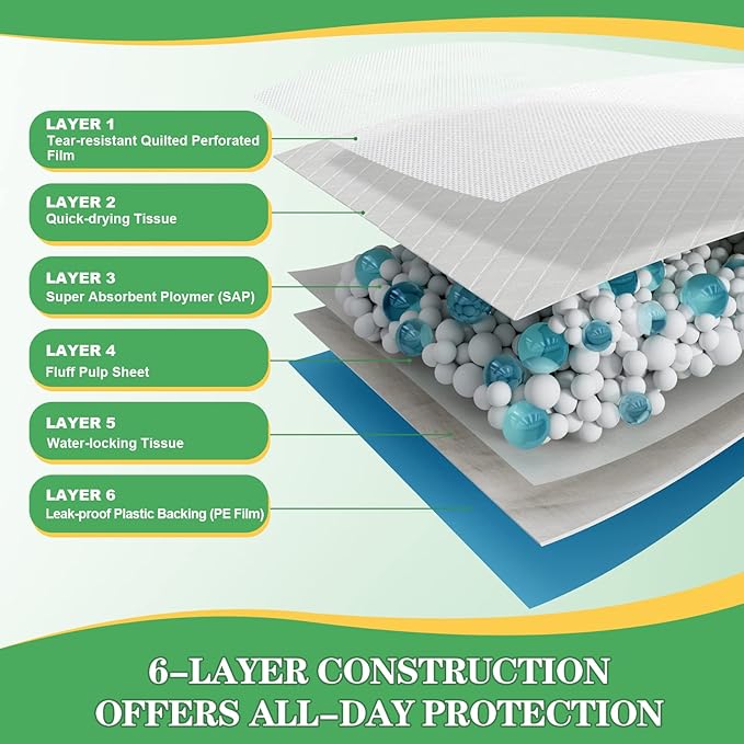 - Super Absorbent and Quick Drying: DEEP DEAR's 6-layer protection design makes our thickened large dog training pads are much more absorbent than most wee wee pee pads for dogs on the market. The dog pee pad uses new premium material perforated film as the top layer of the puppy potty pad which can speed up the liquid to pass through the surface than common non-woven fabric and keep the surface quick-drying, comfortable, no puddling, and no tracking.