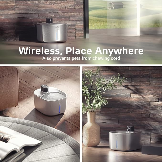 iPettie Runway Battery Cordless Cat Water Fountain Stainless Steel, 1.1Gal/4L Large Capacity, Motion Sensor, 5-Stage Water Filter