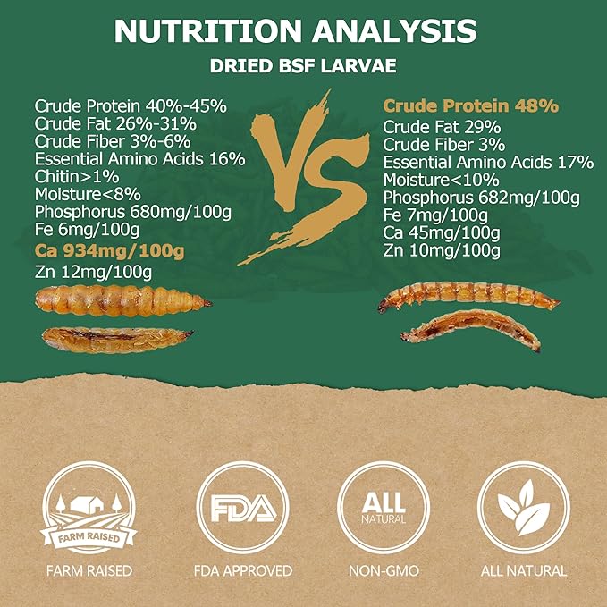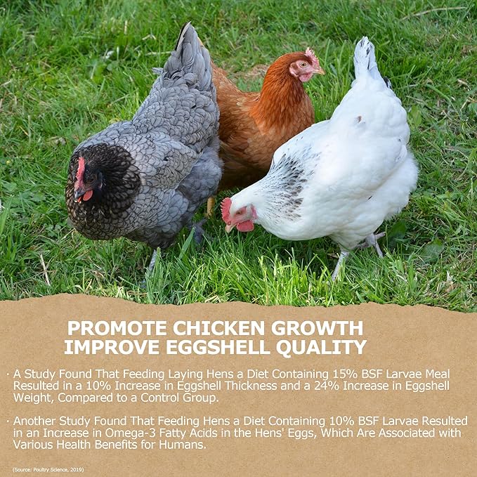 - Empowering Poultry Health: Revel in extraordinary health benefits that invigorate your poultry's well-being - fortified eggshells, amplified energy, and egg production. With calcium levels 85 times that of conventional mealworms, itβs perfect for molting, supplying vital protein and calcium sans extra supplementation.