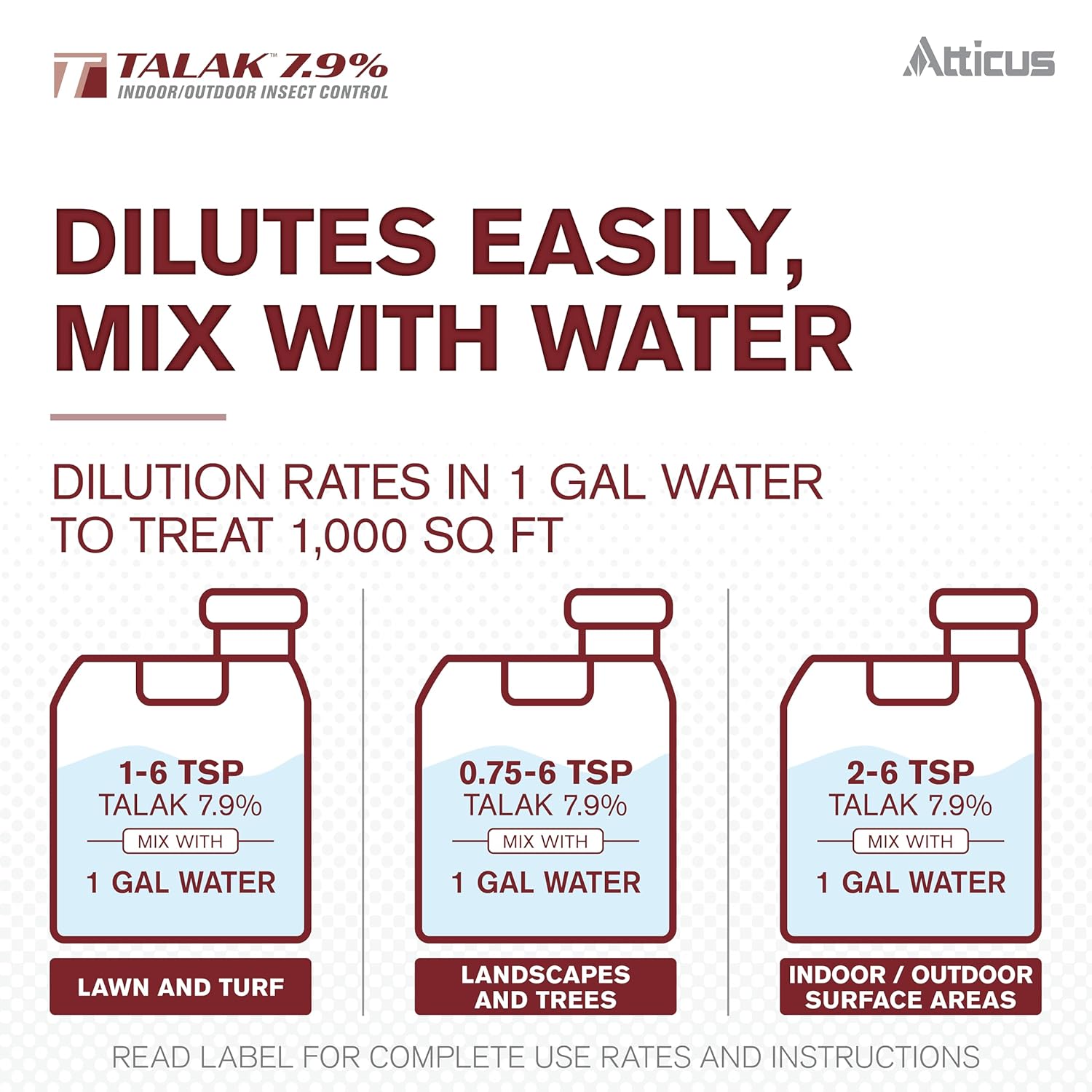 - KILLS ON CONTACT, WORKS UP TO 3 MONTHS: Expect fast results with an active ingredient that gets right to work. Talak 7.9% Indoor/Outdoor Insect Control kills pests on contact and lasts up to 3 months for continued insect control. Simply dilute with the appropriate water amount per intended use and application volume as listed on the label. Once sprays have dried completely, people and pets are free to re-enter the area. Read product label for application rates, dilution rates, and instructions.