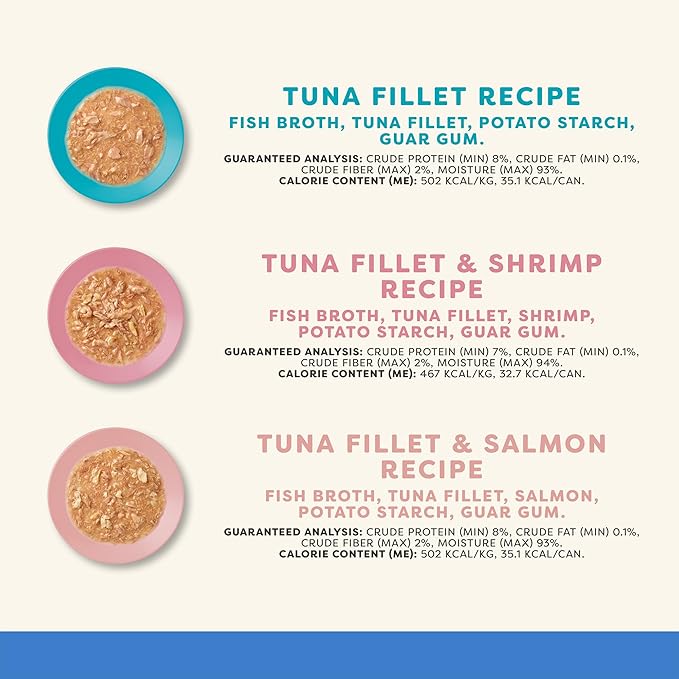 - Each pack includes 4 x Tuna Fillet Recipe, 4 x Tuna Fillet with Shrimp Recipe, and 4 x Tuna Fillet with Salmon Recipe. A total of 12 Cans.