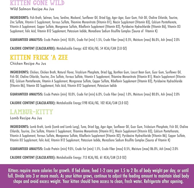 - Variety Pack includes 4 cans of each: Lambur-kitty, Kitten Gone Wild, Kitten Frick 'A Zee