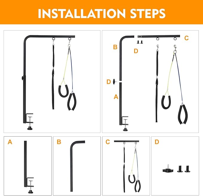 - [Durable Material] Our dog grooming table arm is made of heavy duty metal with rustproof coating. It can stand up to long-term use.This grooming arm features sturdy clamps to securely hold it in place while you groom your furry friend.