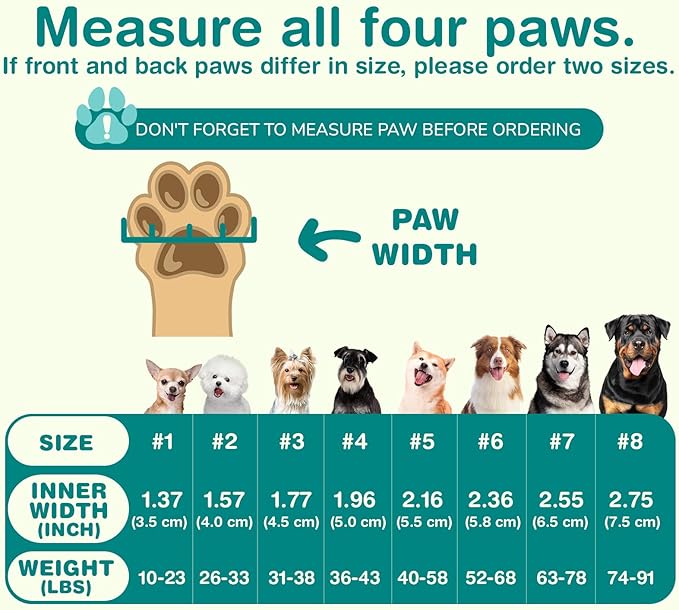 - Size selection: Please measure the width of your dog's four paws, it’s crucial. Different sizes may require two pairs.Weight is only a secondary reference. Size 3 width 1.77 inch for 31-38 lbs