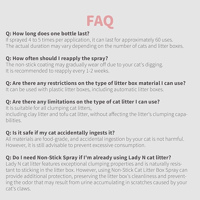 - Effortless Litter Maintenance: Say goodbye to the hassle of scraping and scrubbing. Lady N Non-Stick Spray creates a protective coating in just 4 easy steps, preventing litter from sticking to the bottom and sides of the box, and ensuring a quick and efficient clean-up.