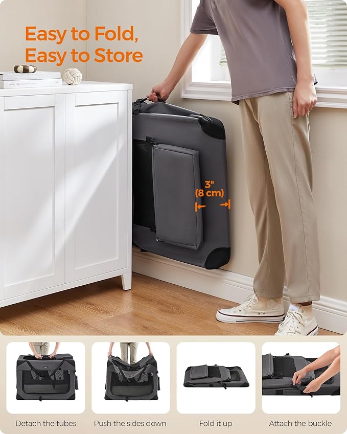 Feandrea 36 Inches Collapsible Soft Dog Crate, Portable Travel Dog Crate for Indoor and Outdoor Use, Dog Carrier Kennel with Safety Zippers, for Living Room, Car, Travelling, Camping, Gray UPDC90G01