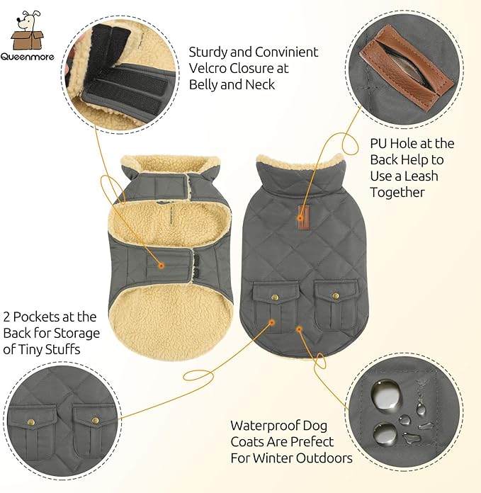 Queenmore Dog Winter Coat - Fleece Jacket, Waterproof Cold Weather Clothes, Thick Warm Cotton Padding, Easy On Storage Pockets (Grey, Medium)