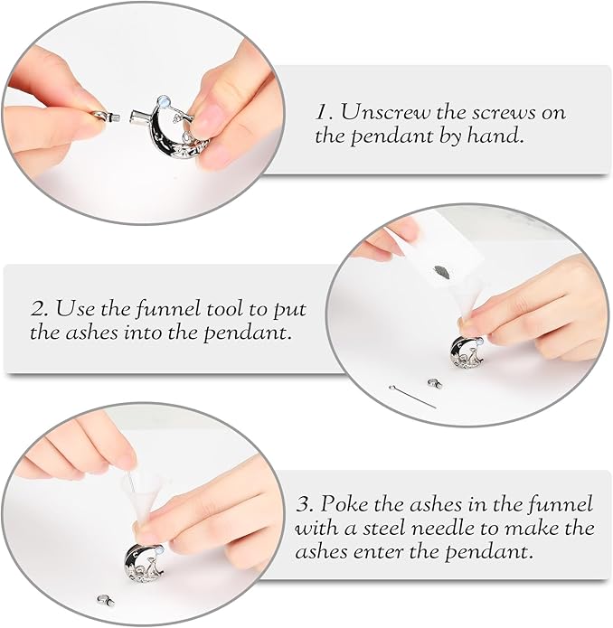 - ☾【Urn Necklace for Ashes】-- The cat memorial necklace can hold a small amount of ashes, dried flowers, perfume, essential oils, a bunch of hair, clay or sand. Loosen the screws, and then use the funnel tool to fill the necklace.