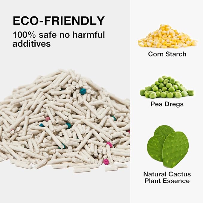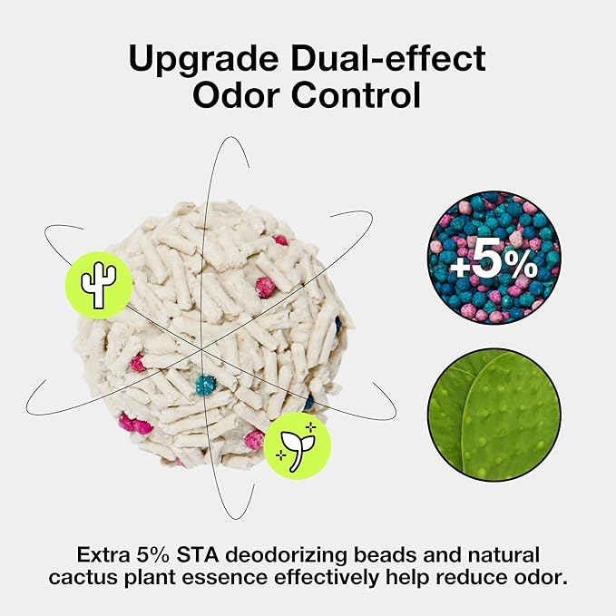 - 【Superior Odor Control】 This tofu litter is infused with natural Cactus plant extract, which can help mask unpleasant odors. Plus, extra added 5% deodorizing beads that effectively control odors, ensuring a fresh and odor-free space
