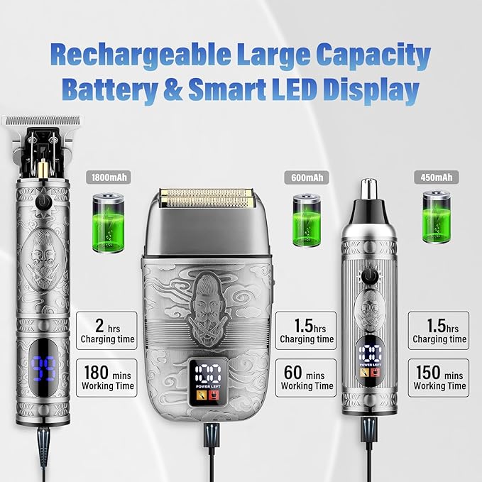 - Smart LED Display and Large Capacity Battery : The smart LED screen clearly displays the percentage of remaining power, reminding to charge and reminding to clean.Our trimmers have a built-in 1800 mAh high capacity battery,if you charge it for 2 hours and can use it for 180 minutes.Nose Trimmer can trimming 150 minutes after for 1.5 hrs charging.This man's razor is suitable for home, travel, business or barbershop use