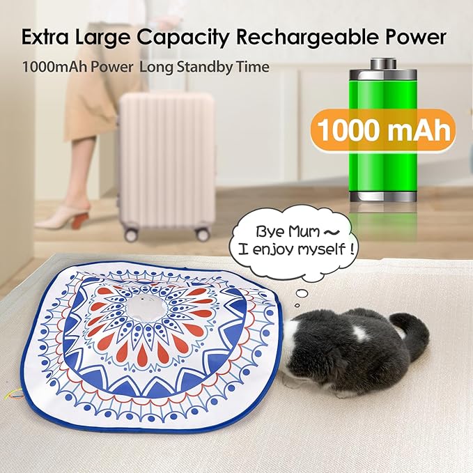 - đăUltra-Long Standby, Fun Endlessă To ensure that your cat can play for a long time, the automatic cat toy built-in rechargeable lithium battery that offers a long-lasting charge, which can satisfy your fur babies to play for several days. No need for frequent recharging, that would be a perfect choice for bored indoor cats ! Tips! please choose the adapter with 5V 1A/2A.