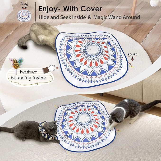 - đ±ă4-in-1 Cat ToysăORSDA 4 in 1 interative cat toys for indoor cats includes Hide and Seek, Chase the Feather, Holes Mice Whack-A-Mole, Catch Magic Wand. which comes with a removable play blanket which allows the toy to move unpredictably, stimulate your cat's hunting instinct.When your cat gets tired of playing with the cover, remove it and the long spinning wand entices your cat to pounce, while the feathers that pop out of the holes stimulate a game of whack-a-mole.