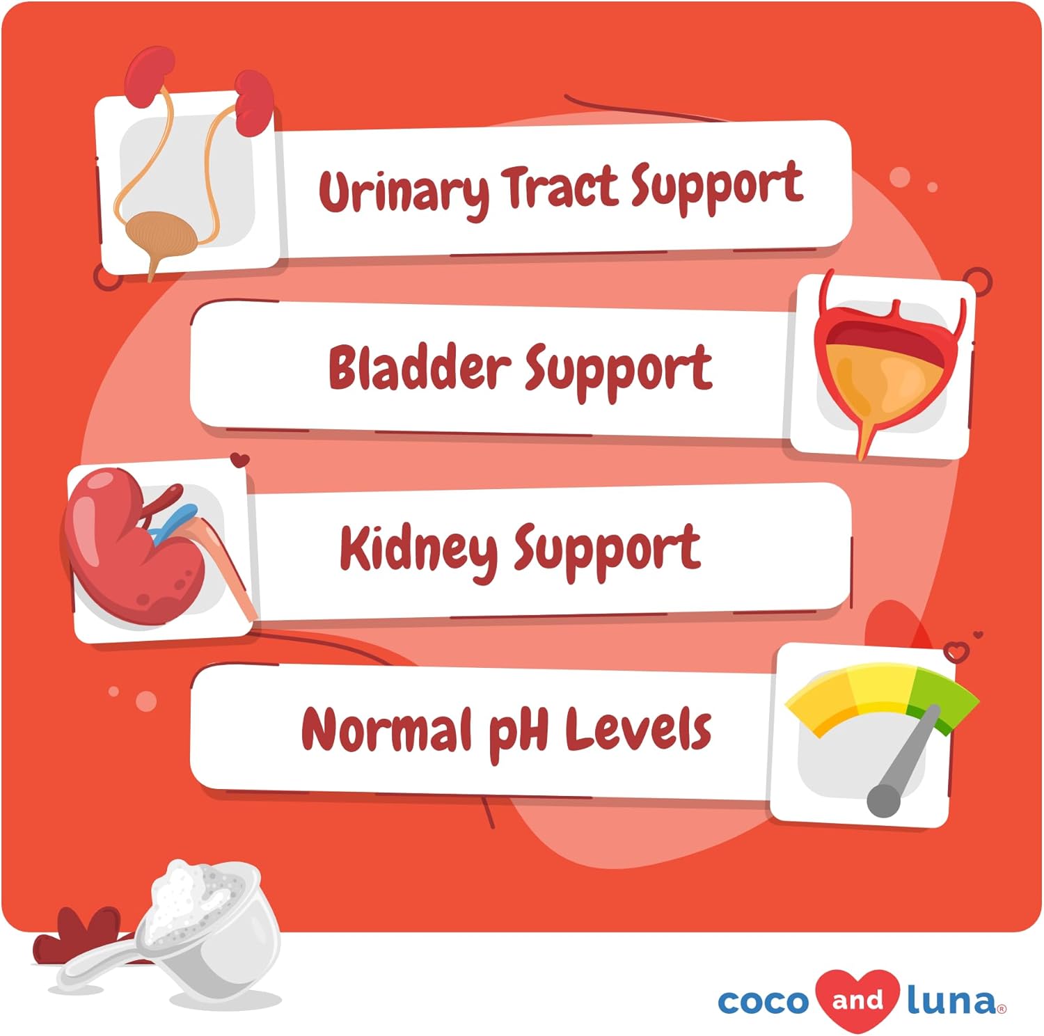 - Natural Urinary Tract Support - Coco and Luna Urinary Tract Support is a natural supplement that contains Cranberries which help soothe any discomfort in the urinary tract.