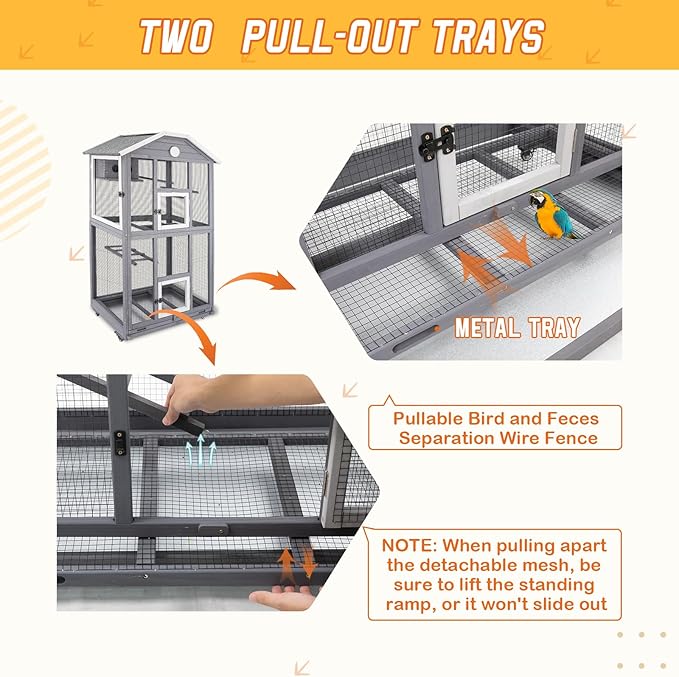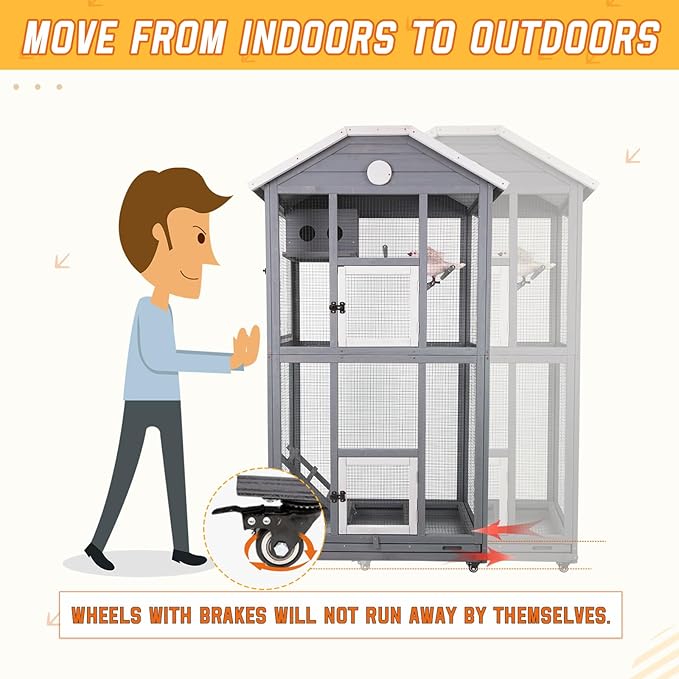 - 【Easy Mobility】Upgraded with bottom casters featuring brakes,you can effortlessly move the aviary to your desired location and then securely lock it in place with the brake mechanism. Say goodbye to unexpected movements and welcome stability and convenience.