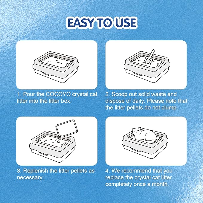 - Less Mess: Crystal cat litter is low-tracking and 99% dust-free—designed for all the days you don’t want to sweep the laundry room floor. Silica Gel micro crystals provide maximum comfort on cats' paws and powerful clumping for easy scooping and a refreshing litter experience.