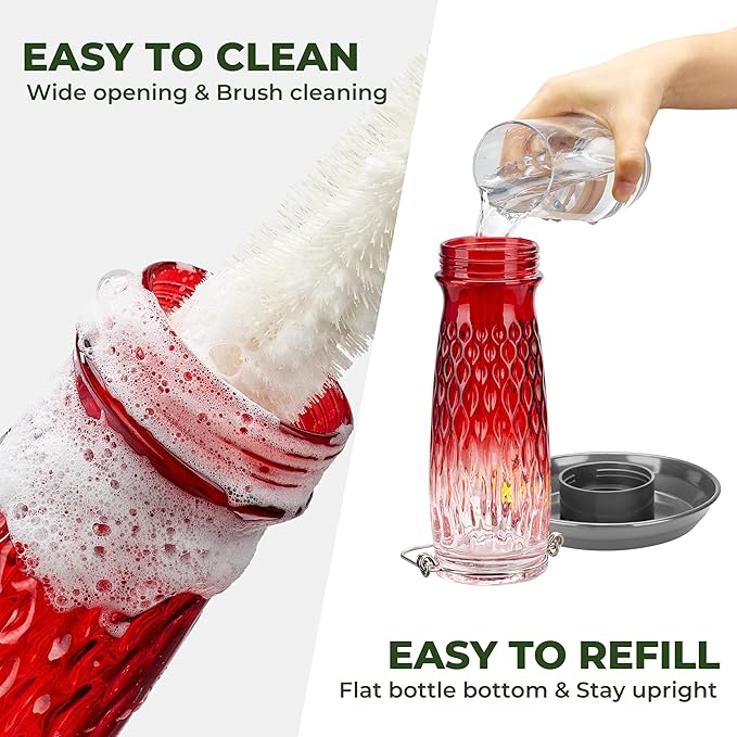 Kingsyard Bird Water Feeder for Outside, 24 Ounce, Glass Bird Water Dispenser with Metal Hanging for Garden Yard Outside Decoration, Red Gradient
