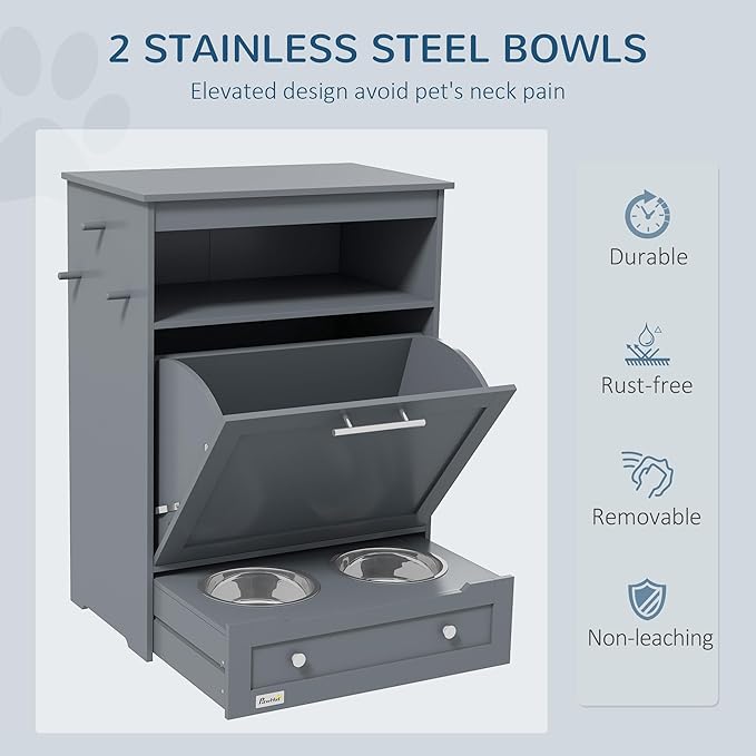 PawHut Dog Feeding Station, Dog Food Storage Pet Feeder Cabinet Container with Raised Bowls and Hanger for Feeding & Watering Supplies, Gray