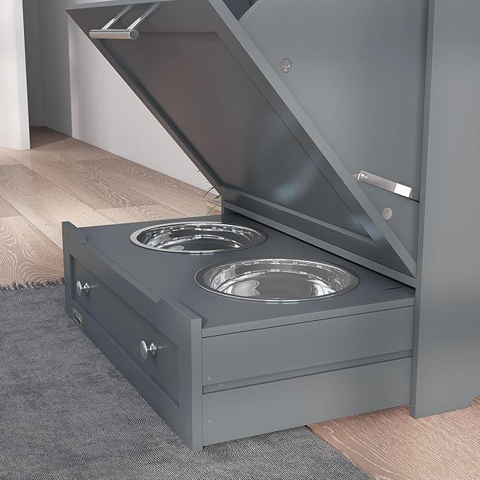 - Pet Feeder: When it's time to eat, pull out the bottom drawer to reveal a food and water bowl. When feeding time is over, simply push it back in.