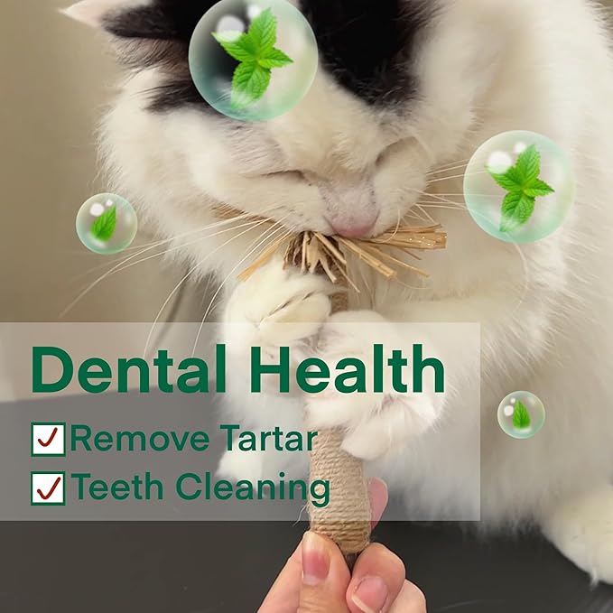 - [Teeth Cleaning] Silvervine and gall fruit are rich in Actinidine and Nepetalactone, enticing your cat and helping them relieve stress. Plus, the natural sisal rope and raffia aid in cleaning teeth, eliminating plaque and tartar, and ensuring excellent oral hygiene and fresh breath