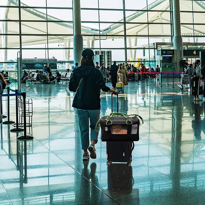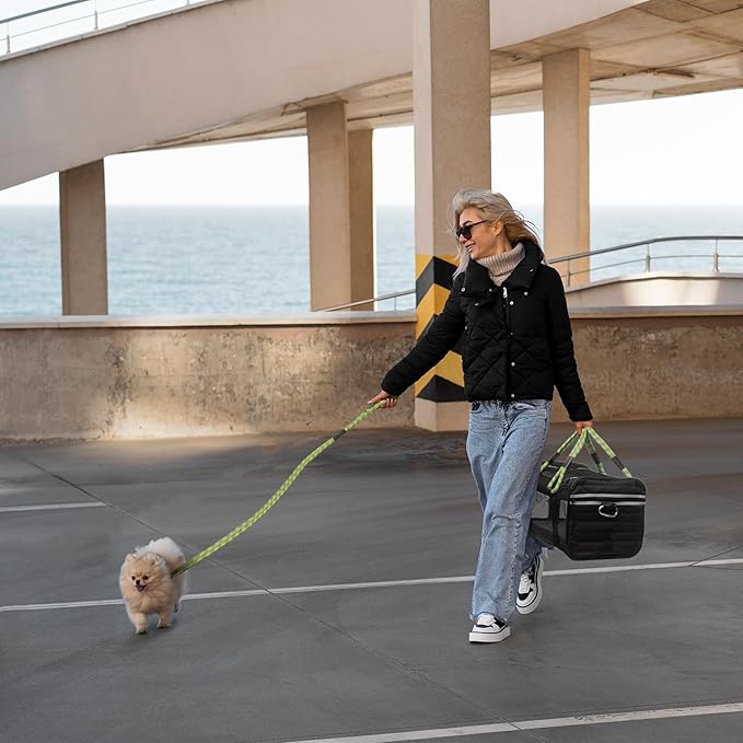 | TSA Airline Approved |Soft Sided Pet Carrier | Cat Carrier | Dog Carrier| Pets Up to 15 lbs | Leash & Luggage Strap | Black with Green Handle