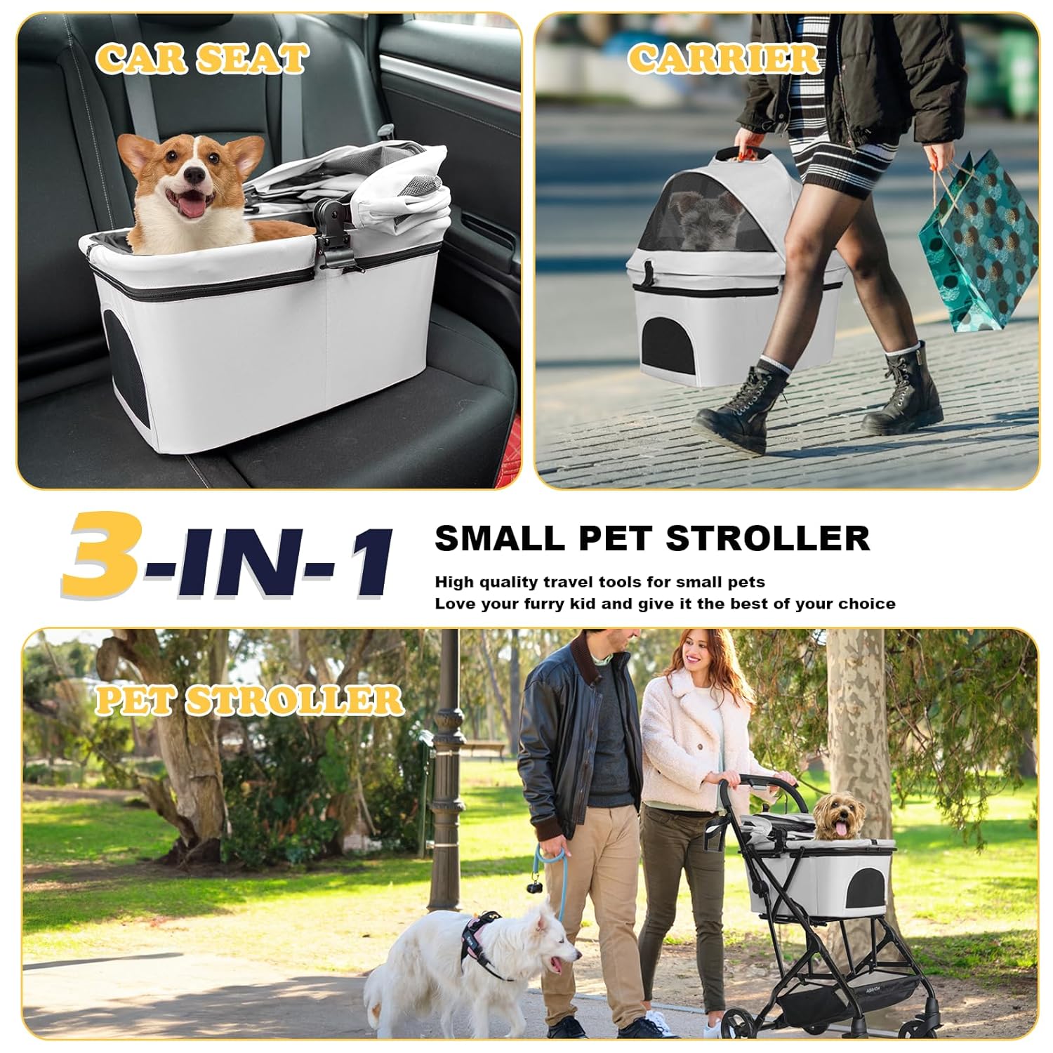 Dog Stroller for Small Dogs Cats Up to 33LBS, 3-in-1 Lightweight Foldable Pet Stroller with Removable Carrier, Storage Basket for Travel- Gray