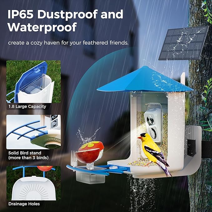- Bird-Friendly Design: Dual-function sound system allows you to enjoy the melodious songs of birds and deter squirrels and predators. It is constructed with durability in mind, making it resilient to wear and tear, and it is easily cleaned. IP waterproof is suitable for all kinds of weather. The feeder also offers a range of DIY assembly accessories such as hummingbird feeder with camera, water trays, and fruit forks, catering to the specific requirements of various bird species.