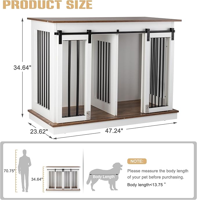 - 🐶【Kind Tips】The dimensions of our dog crate furniture are 47"L x 24"W x 35"H, this dog crate furniture is ideal 1 large dog or 2 small dogs.We recommend measuring your pet's height and length before making a purchase to ensure a comfortable fit inside the crate.