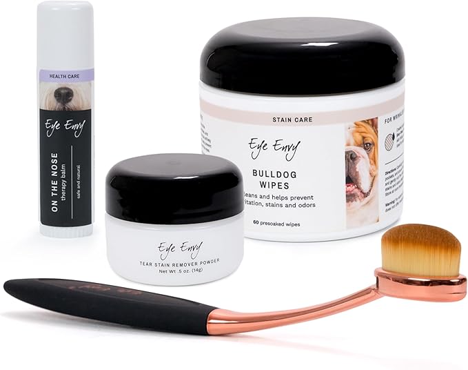 - BULLDOG CARE KIT: A complete care kit for bulldogs, treating skin issues between folds, tear stains and chapped, dry noses. Contains four products: Bulldog Wrinkle Wipes 60 count, Tear Stain Remover Powder .5 oz, ProPowder Applicator Brush, and On The Nose Balm .5oz. Ideal for flat-faced breeds such as English Bulldogs, French Bulldogs, Mastiffs, Pugs, etc.