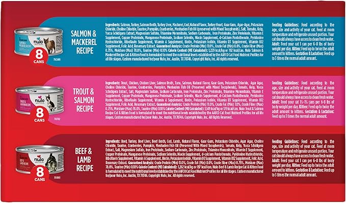 - Nulo Cat GF Salmon Trout Beef Variety Pack - 5.5 oz. - 3 Flavors - Salmon & Mackerel, Trout & Salmon, and Beef & Lamb (24 Cans Total)