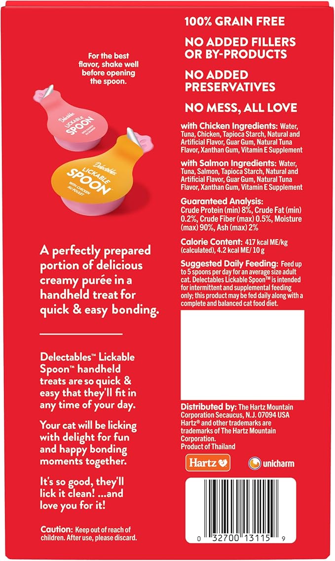 Hartz Delectables Lickable Spoon Handheld Wet Cat Treats Made with Real Chicken & Salmon, Quick & Easy Creamy Puree, Mess Free, Grain-Free, No Added Fillers, No by-Products, Variety Pack, 32ct