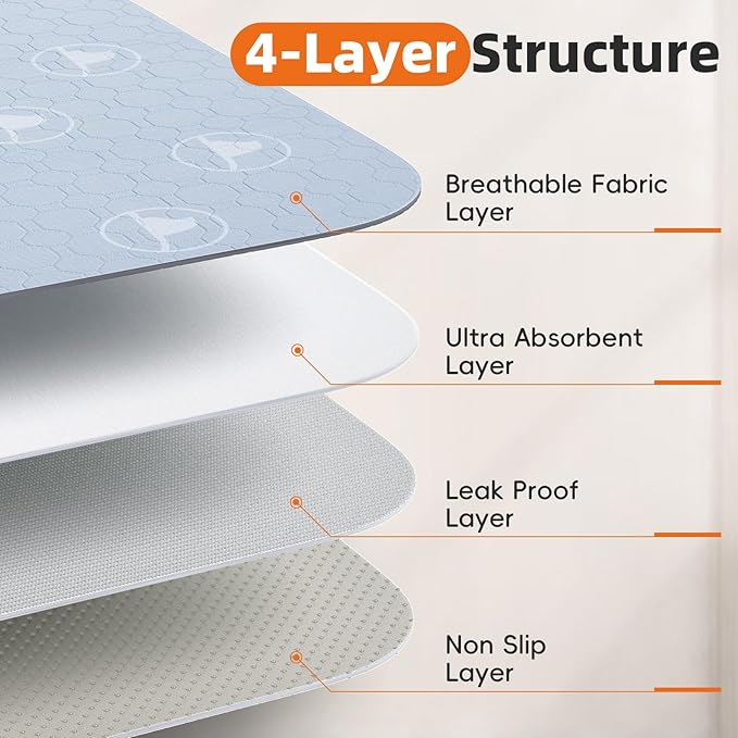 - 4-Layer Protection System: Breathable top layer guides liquid to the 10 mins quick-dry core, leak-proof barrier prevents seepage, and non-slip base stays in place. Shield floors, furniture, and car interiors from accidents