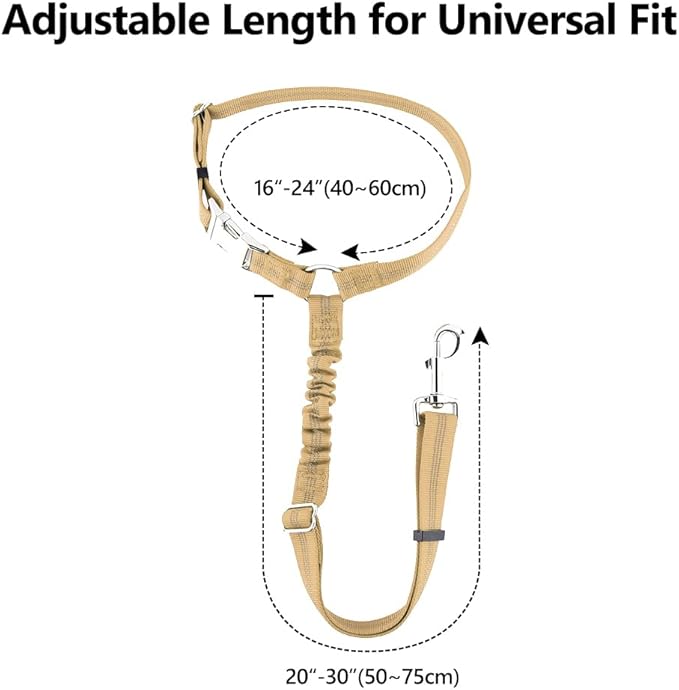 - Adjustable Length. With a metal adjustable buckle and built-in bungee, the leash can be adjusted from 20” to 30”, and can be stretched to 34” for the maximum length, providing enough space for your dog to sit, stand, lie down, and reach for the window.
