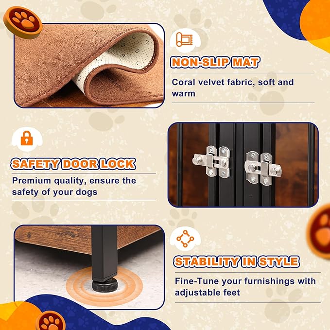 - With Plush Cushion: Our wood dog crate is paired with a skin-friendly dog mat which is easy to clean and pull out through the crate side, ensures your dog's comfort while resting. The adjustable feet add extra stability to the entire crate.