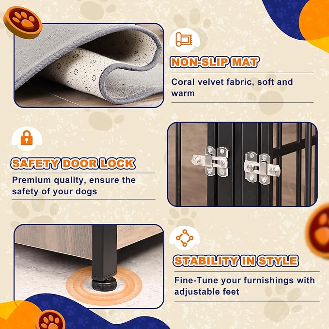 - With Plush Cushion: Our wood dog crate is paired with a skin-friendly dog mat which is easy to clean and pull out through the crate side, ensures your dog's comfort while resting. The adjustable feet add extra stability to the entire crate.